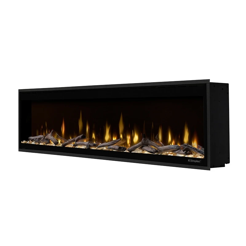The Dimplex Ignite Evolve 74″ Built-in Linear Electric Fireplace captivates with ultra-realistic flames glowing amidst multi-tonal tumbled glass, complemented by lifelike driftwood logs.