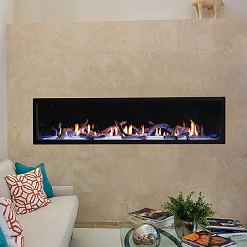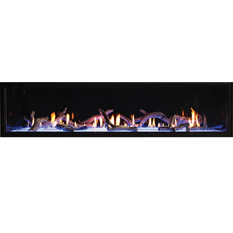 The fully recessed burner fills the fireplace with vivacious flames. Crushed glass (sold separately) will cover the fireplace floor while the lighting lets you set the perfect mood. Visit our Fire Glass section of our website to see an almost endless variety of beautiful fire glass. The glass allows the under-floor white light system to shine through. The 72″ comes standard with multi-color LED lighting.