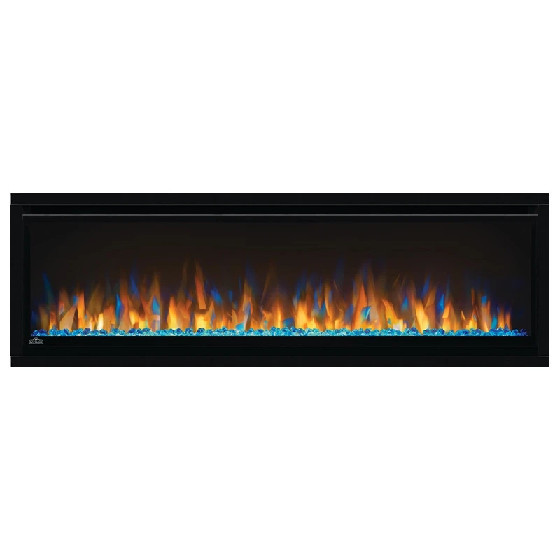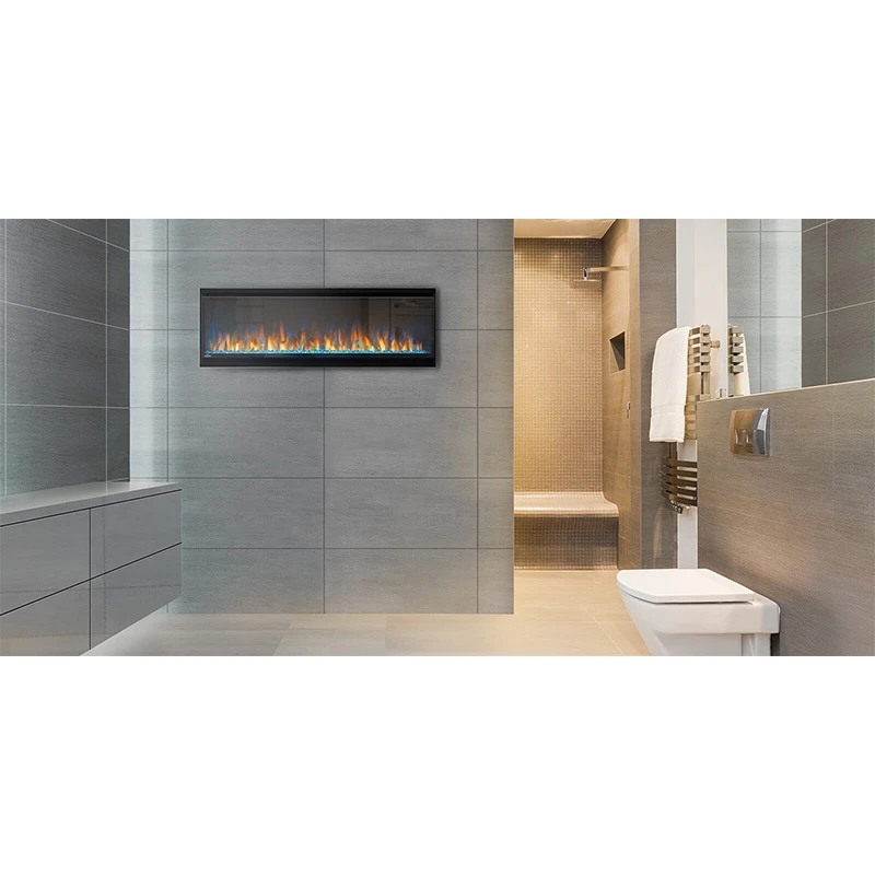 Napoleon Alluravision Slimline Series stands out from the rest of the electric fireplaces with their nearly frame less viewing area which highlights the unique flame colors. With multi-color options, set the mood with yellow, orange, blue and multi color flames with the push of a button. Easy to use, these electric fireplaces are plug and play – just hang on the wall and plug them in. The Alluravision Series can also be hardwired to 120 v (slim) or 240 v (deep models). Three sizes, 42, 50, and 60-inch, come standard with a crystal media ember bed and remote control. The night light and glass media with driftwood make beautiful additions to the deep model. Napoleon’s Alluravision Series linear electric fireplaces are about adding the fireplace, and not the frame to your favorite room.