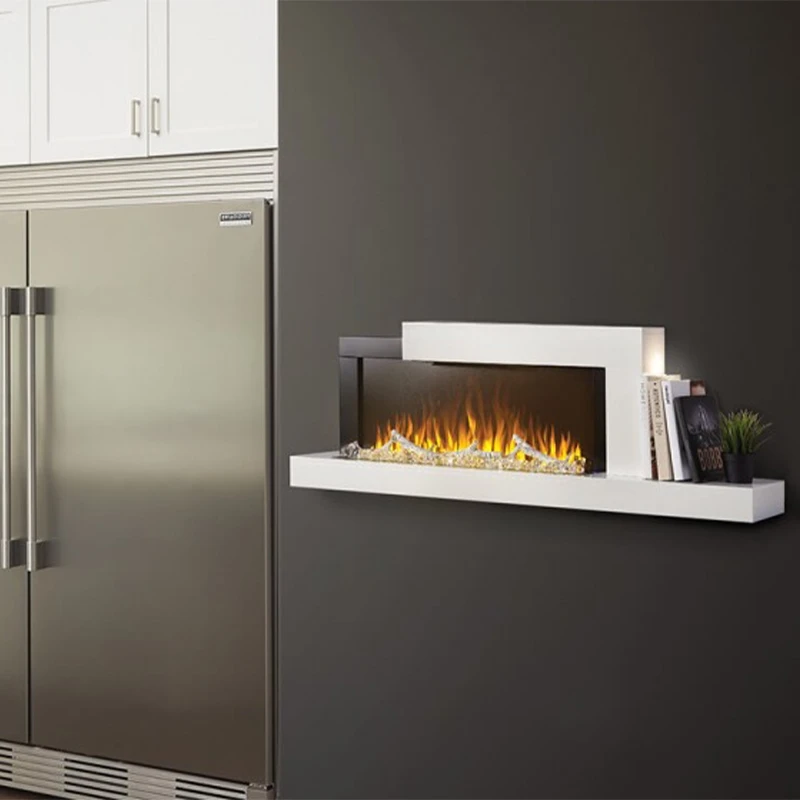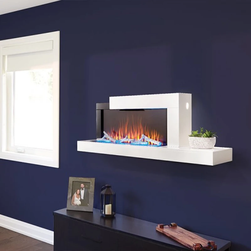 The NEW Napoleon Stylus Wallmount Electric Fireplace is the perfect addition to any indoor living space! This unit falls under the furniture category with a shelf lit up by an accent light as well as a smart LED double USB plug that indicates when your phone is fully charged. The electric fireplace has four color settings as well as five brightness settings. Customize your electric unit with the remote control that is included. Choose from a variety of colors such as yellow, blue, purple or multiple flames.