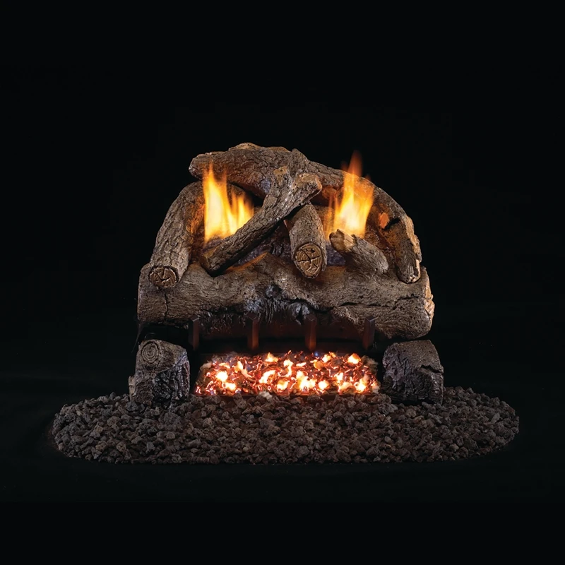 The Evening Fyre, Evening Fyre Charred and the Evening Fyre Split log sets are featured on the advanced G18 vent-free burner system. The logs are sculpted and hand-painted with distinctive charring on the front log, mimicking a wood fire. The dramatic ember bed, with Bryte Coals and two wood chunk decorative covers, enhance the warmth and beauty of the log set.